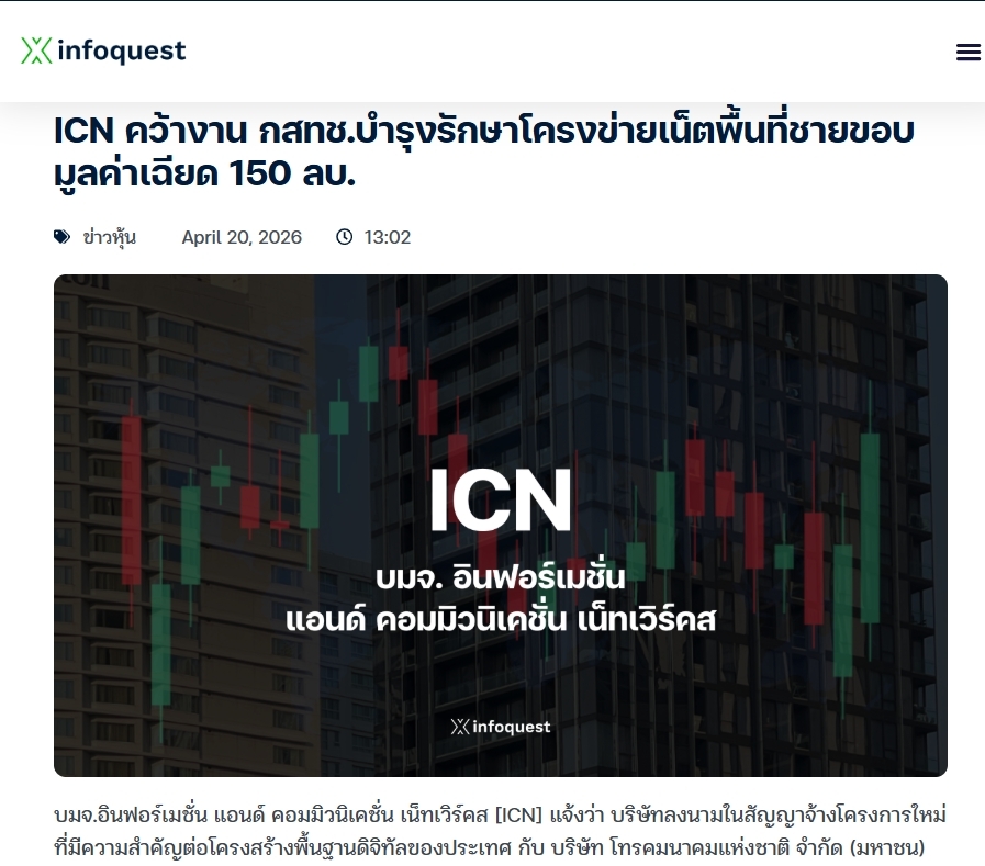 บมจ.อินฟอร์เมชั่น แอนด์ คอมมิวนิเคชั่น เน็ทเวิร์คส [ICN] แจ้งว่า บริษัทลงนามในสัญญาจ้างโครงการใหม่ที่มีความสำคัญต่อโครงสร้างพื้นฐานดิจิทัลของประเทศ กับ บริษัท โทรคมนาคมแห่งชาติ จำกัด (มหาชน) หรือ NT เป็นงานจ้างบำรุงรักษาเครือข่ายสายเคเบิลใยแก้วนำแสง (Fiber Optic) และอุปกรณ์ พร้อมการบริหารจัดการ ในโครงการจัดให้มีสัญญาณโทรศัพท์เคลื่อนที่และอินเทอร์เน็ตความเร็วสูงในพื้นที่ชายขอบ (Zone C+) พื้นที่ดำเนินการครอบคลุมพื้นที่หมู่บ้านชายขอบในกลุ่ม 2 (ภาคเหนือ 2) และกลุ่ม 3 (ภาคตะวันออกเฉียงเหนือ) สำหรับสำนักงาน กสทช. มูลค่าโครงการ: รวมทั้งสิ้น 149,800,000.00 บาท (รวมภาษีมูลค่าเพิ่ม) ระยะเวลาการดำเนินงานกำหนดให้แล้วเสร็จภายใน 11 เดือน