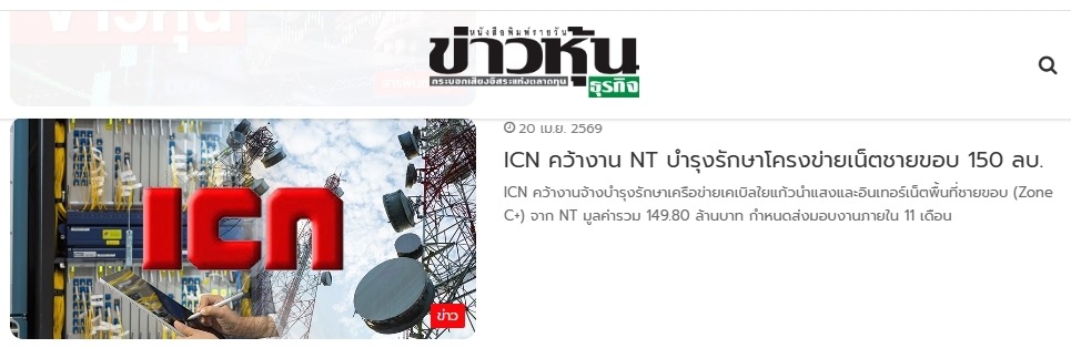 ICN คว้างานจ้างบำรุงรักษาเครือข่ายเคเบิลใยแก้วนำแสงและอินเทอร์เน็ตพื้นที่ชายขอบ (Zone C+) จาก NT มูลค่ารวม 149.80 ล้านบาท